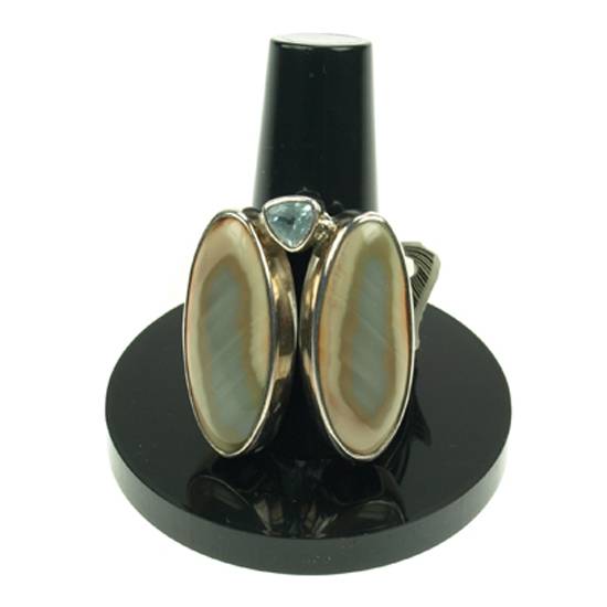 This 925 silver ring is set with two oval-shaped semi-precious stones of the same size. The stones include imperial japser and aquamarine. They are placed side by side, with a triangular faceted stone on top of them, sparkling nicely.