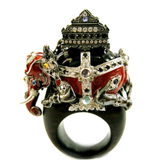 This unique ring showcases a religious-themed design with a temple and elephant accent. It is decorated with colored shiny stones for added style. Draw attention to your hand with this one-of-a-kind ring.