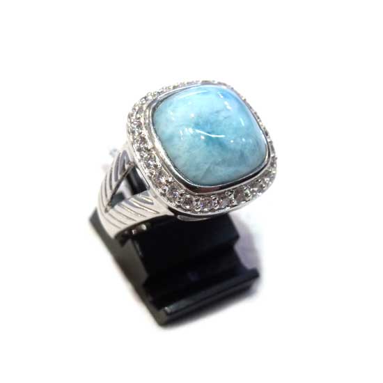 This is stylish finger ring that is made of silver and shimmers with a highly glossy finish. It is accented with a large square cushion-cut larimar stone as the centerpiece for a sense of attractiveness. This elegant finger ring is an ideal addition to complete your jewelry box.