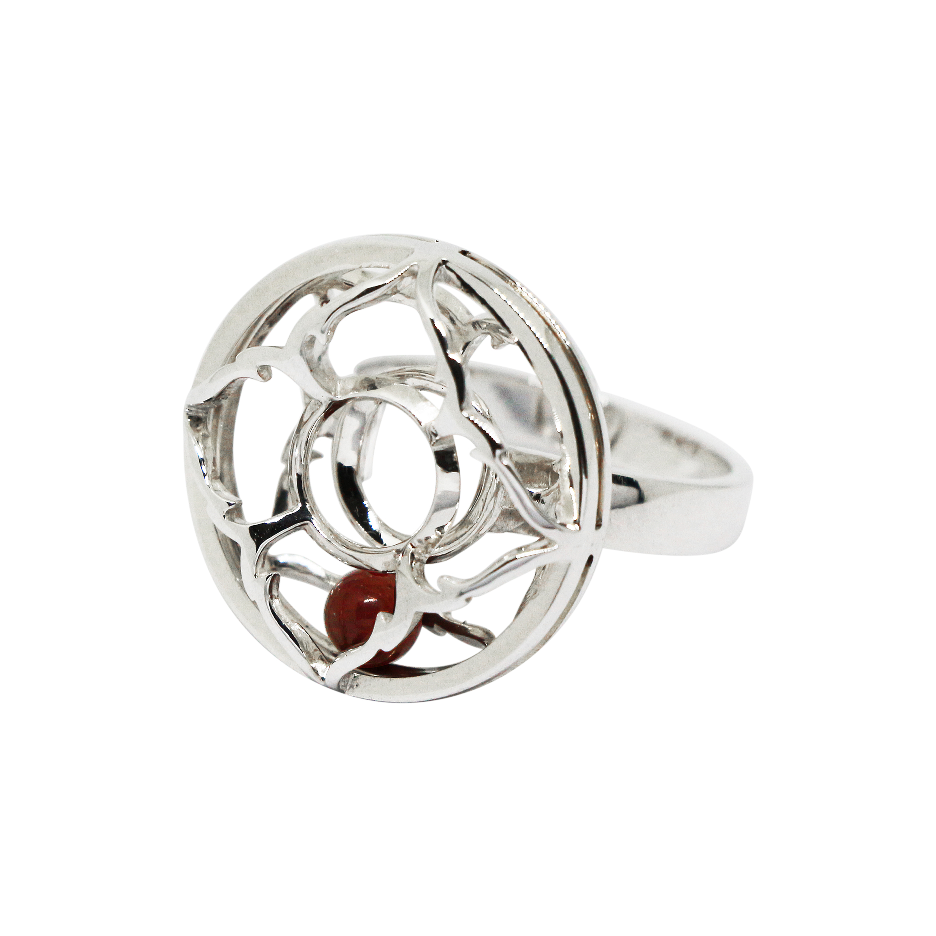Give a dash of romantic twinkles to your fingers with this ring. Declaring timeless beauty with a silver construction, the statement-making accessory is ingeniously rendered into the shape of a fully-blossomed lotus flower. Encaged with a floating coral bead inside the lotus frame, it boasts to spice up your every posture or movement with a pop of pizazz.