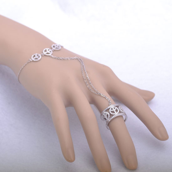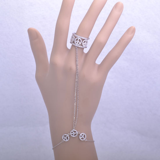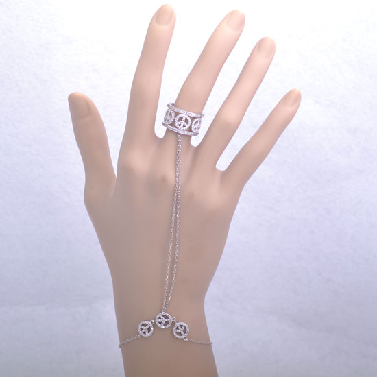 The slave bracelet features a bold finger ring that is connected to the silver bracelet. The peace sign charms are dainty and elegant. It is a gorgeous piece to showcase the beautiful contour of your wrist.
