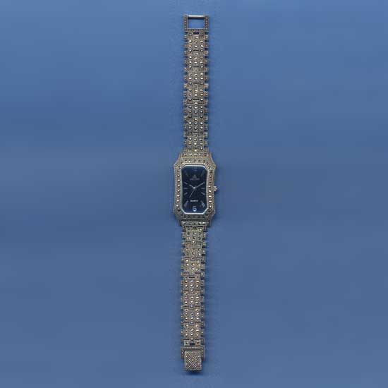 Presented here is a silver watch with an antique design. The antique watch is set with marcasite stones for an extra touch of style. Keep your time and stay in style with this exquisite silver watch.