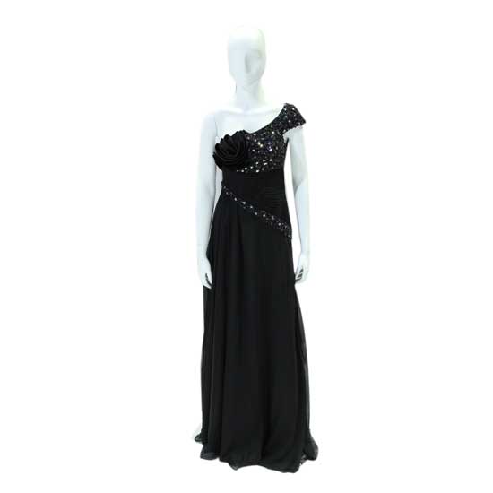 This graceful evening dress features attractive beaded detail along the neckline. A bold floral adornment echoes the elegant pleats on the body. This floor-length dress allows the wearer to stand out in any occasion.