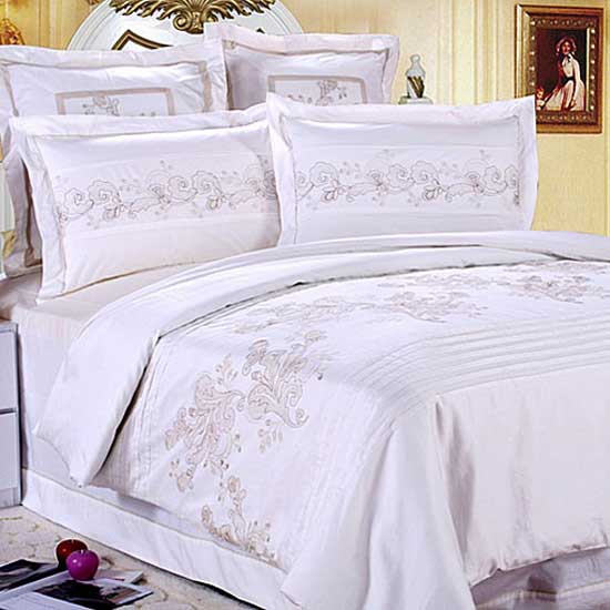 The six-piece bedding set features an embroidered design with delicate foliage patterns. It includes a quilt cover, a flat sheet, 2 pillow covers, and two cushions. Slumber in luxury with this comfortable bedding set.