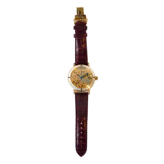 Showcased is a mechanical jewelry watch made with a unique skeleton design. The round bezel is fully decorated with gemstones. This luxurious jewelry watch exhibits great craftsmanship and sophisticated taste.