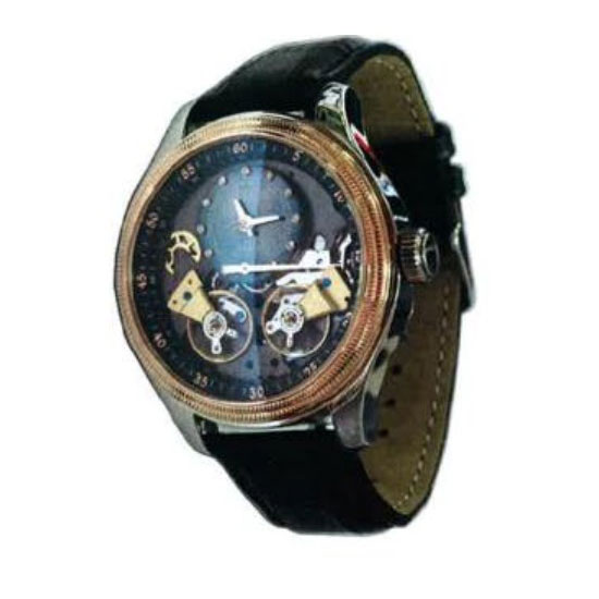 Available is a skeleton watch with a see-through dial. The round bezel touts a bronze color that contrasts with the silvery metal case. The black leather-like straps give a more sophisticated vibe on men’s wrists.