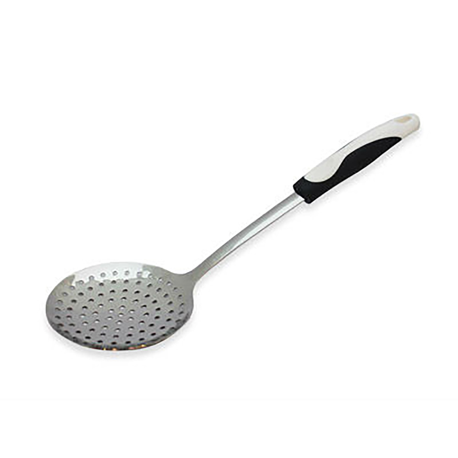 Stainless steel kitchen skimmer with rubberized handle includes the following features: