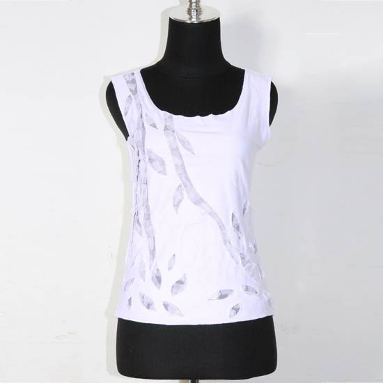This is a ladies casual wear sleeveless blouse that is white with a simple grey pattern of branches and leaves. Lightweight and well made, it is both casual and sophisticated at the same time. Comfortable to wear, it is suitable for almost any casual occasion.