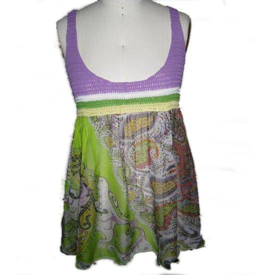 The stylish sleeveless knee-length A-shape dress comes with a deep U-neckline and purple crochet bodice. It features a crochet empire waistline of horizontal white, green and yellow stripes. Also highlighted is the flare bottom with vivid floral prints. Soft and breathable fabrics make the piece an ideal option for ladies to complete their summer closet.