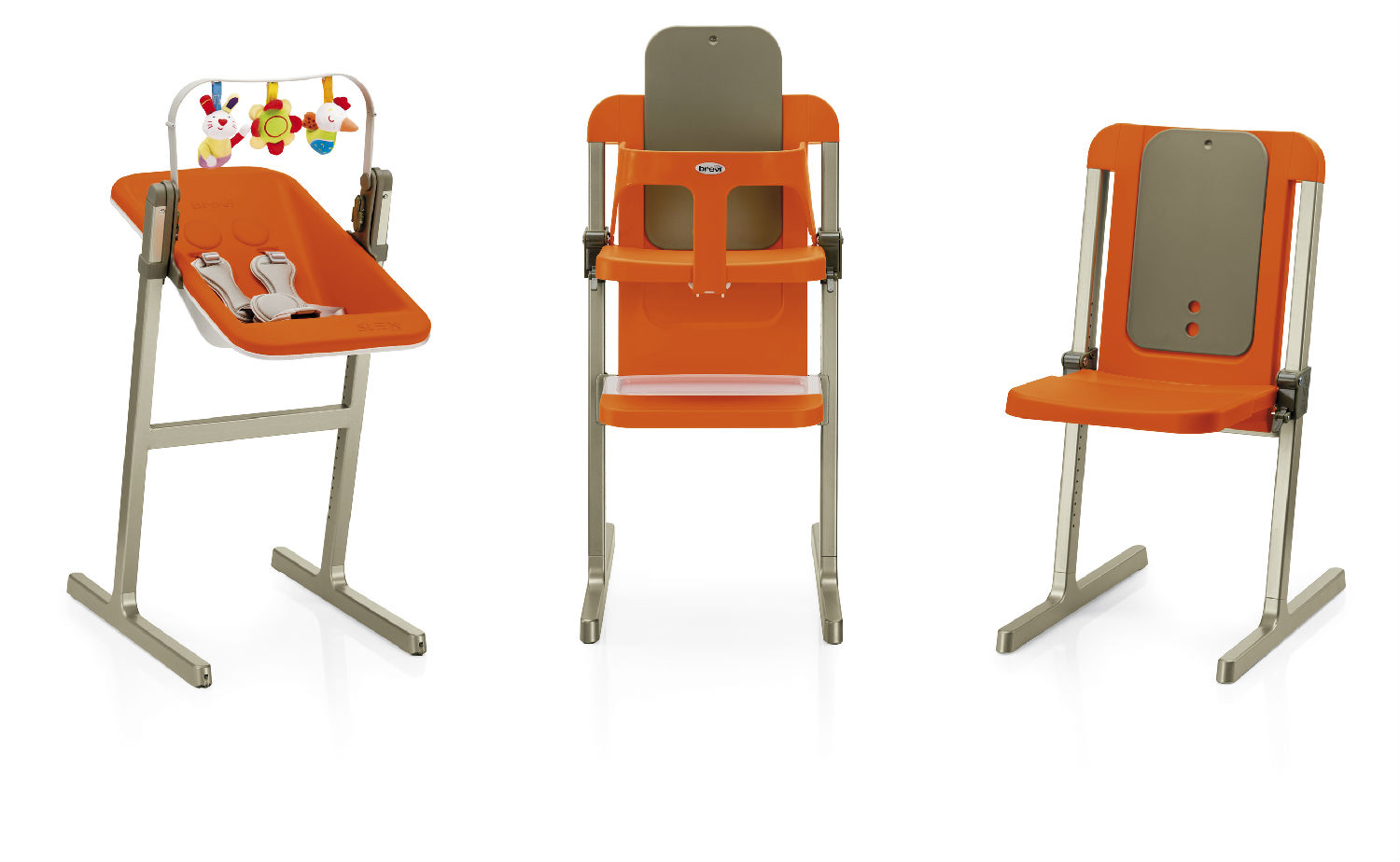 Modular system converting from cradle to high chair and adult chair. Suitable from Birth. Ergonomic as it follows the baby's growth. Suitable for modern peninsula kitchens.