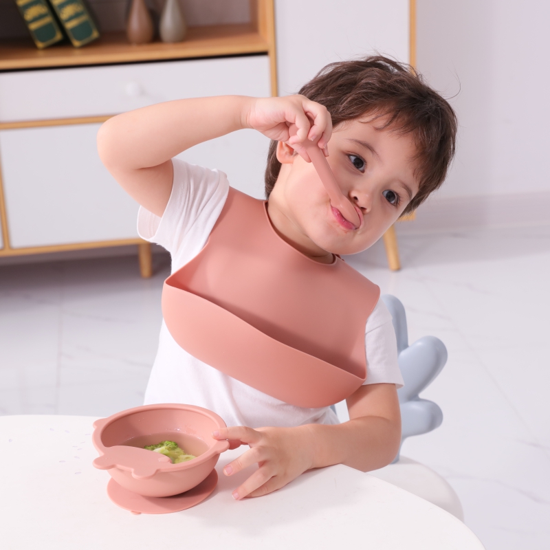 1. Perfect kids dinner tableware includes Silicone Bib, Suction Bowl, Soft Spoon Fork, Plate & Cup help kids self feeding.2. Suction cup bottom firmly and securely stay in one place.