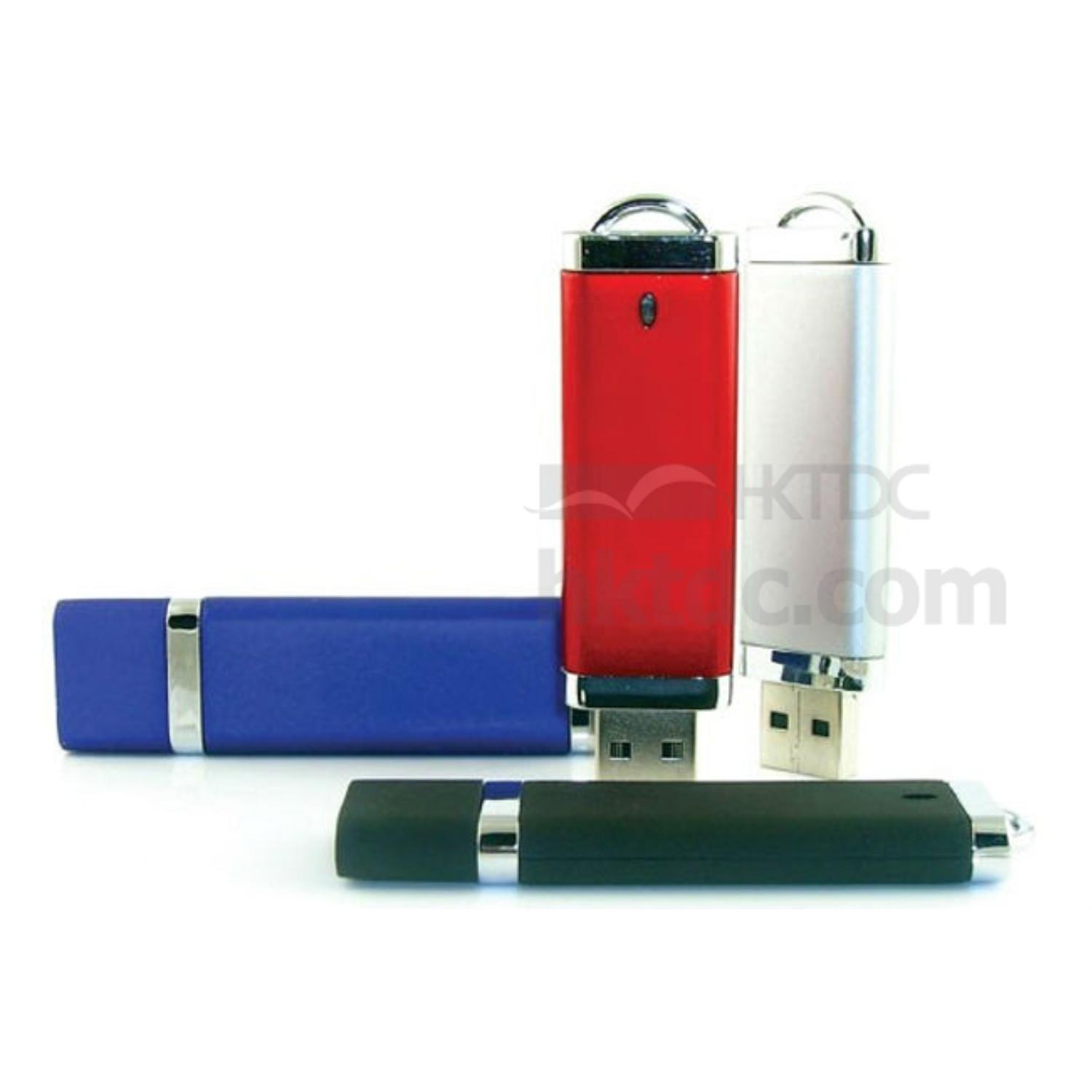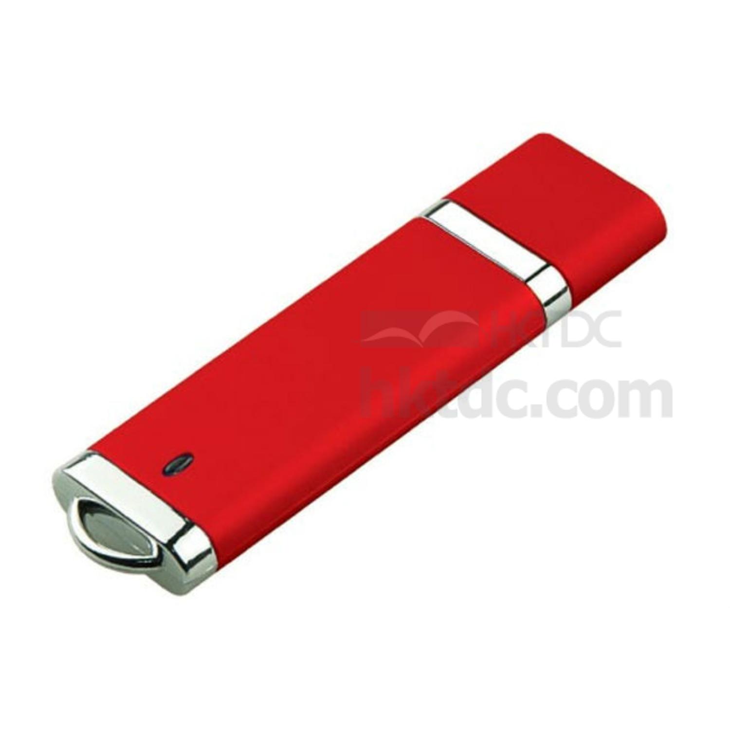 Slim plastic USB drive. Body available in a variety of matte and glossy finishes. Chrome accents and keyloop. Punchout for LED read/write indicator.
