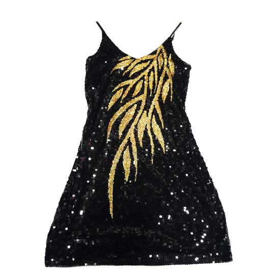 This slip dress features a sweetheart-shaped neckline and two spaghetti shoulder straps. The dress is finely handcrafted with allover sequins that add a sense of brilliance. The sparkling golden-colored leaf design on the front highlights this enchanting dress.