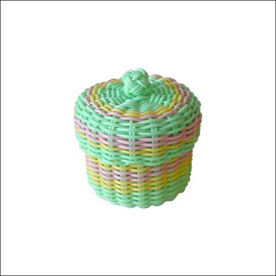Made of plastic of bright fluuorescent colours and comes with a lid