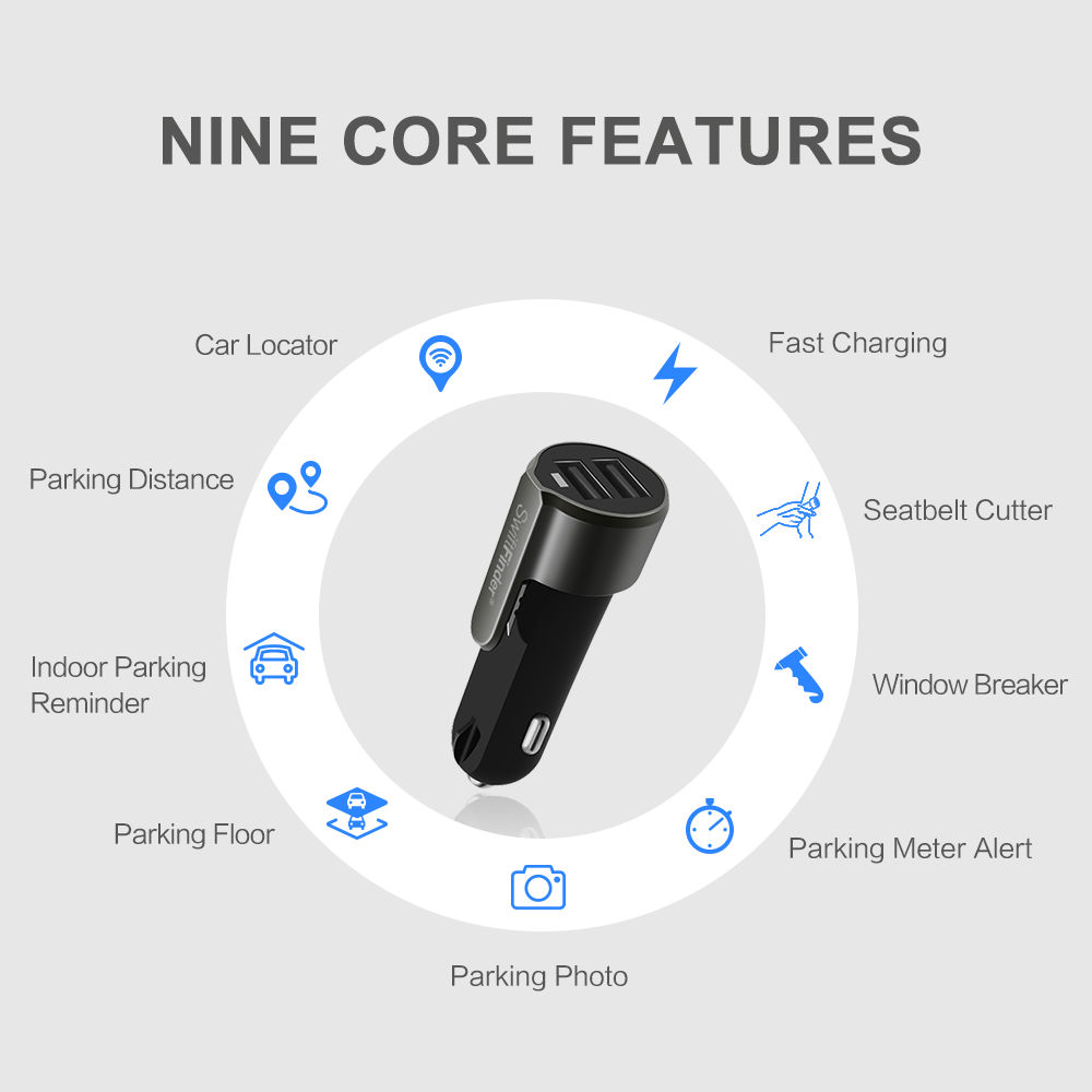 Main function:Phone Chager,Car Locator,Indoor Parking Reminder,Parking Meter Alert,Dual USB Port at 3A Max Speed,Emergency Window Breaker,Emergency Seatbelt Cutter