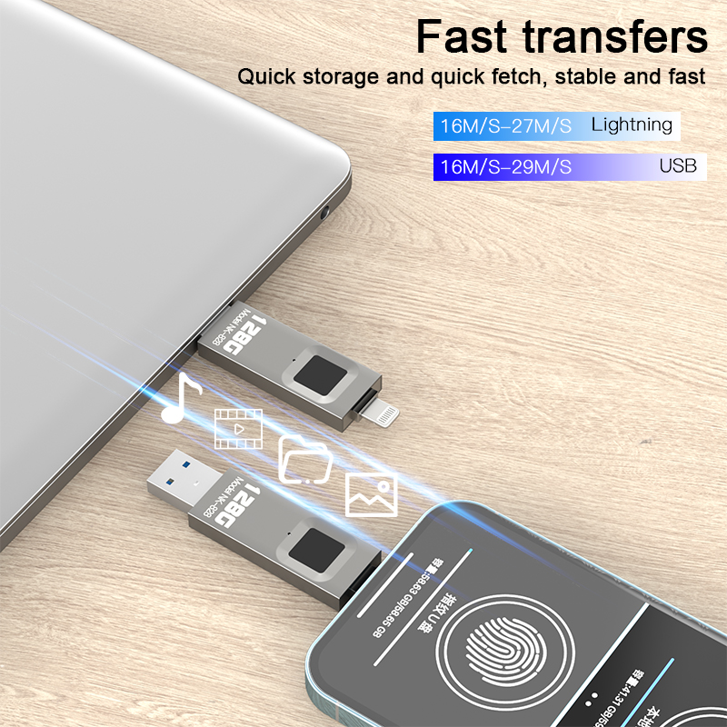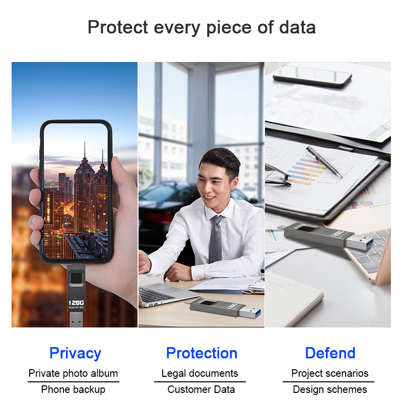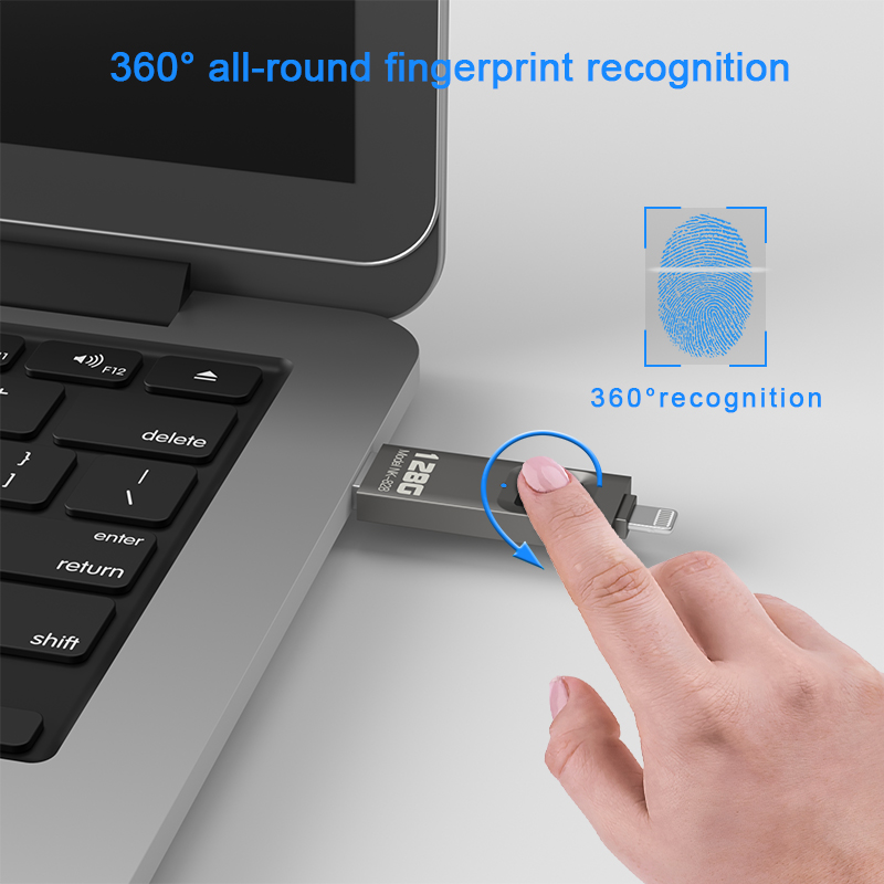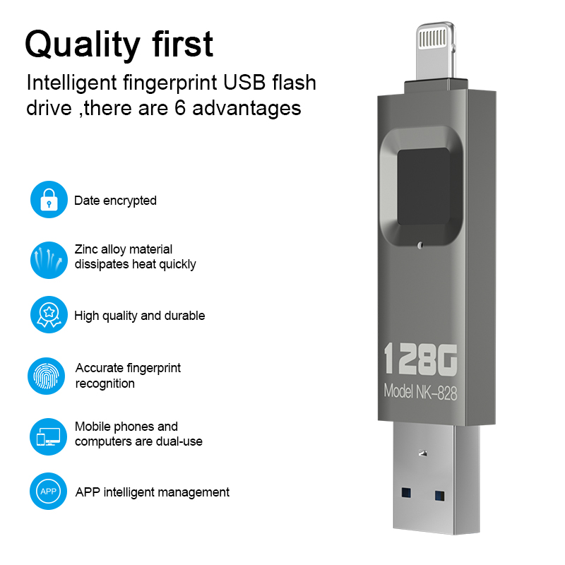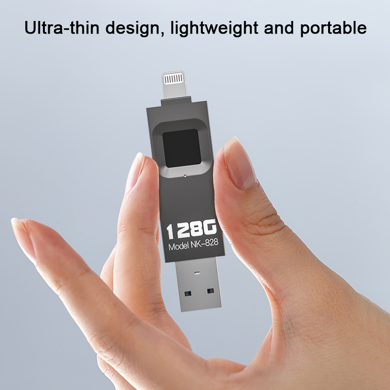 As a professional digital accessories provider, ZOIOT presents the NK-828 fingerprint encrypted USB flash drive, designed for secure data storage and seamless cross-device use. Featuring dual Lightning and USB-A interfaces, it supports fast transfers (16-29MB/s) across iOS, Android, Windows, and Mac systems, enabling direct backup of photos, videos, and files from mobile devices. With 360° highly sensitive fingerprint recognition (0.5-second unlock) and full-disk encryption, it safeguards privacy and prevents unauthorized copying, utilizing 100% of storage space. Its ultra-thin, portable design ensures easy carry, making it ideal for protecting legal documents, business data, and personal files, catering to cross-border e-commerce, wholesale, and corporate procurement needs with reliable quality.