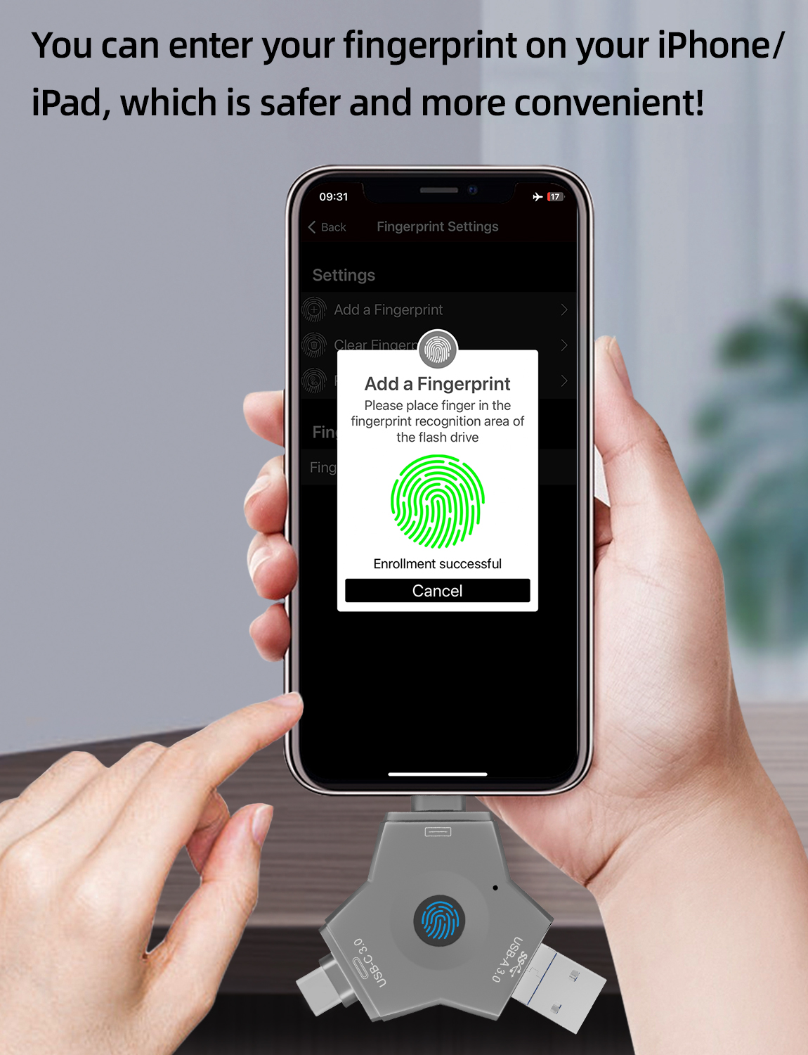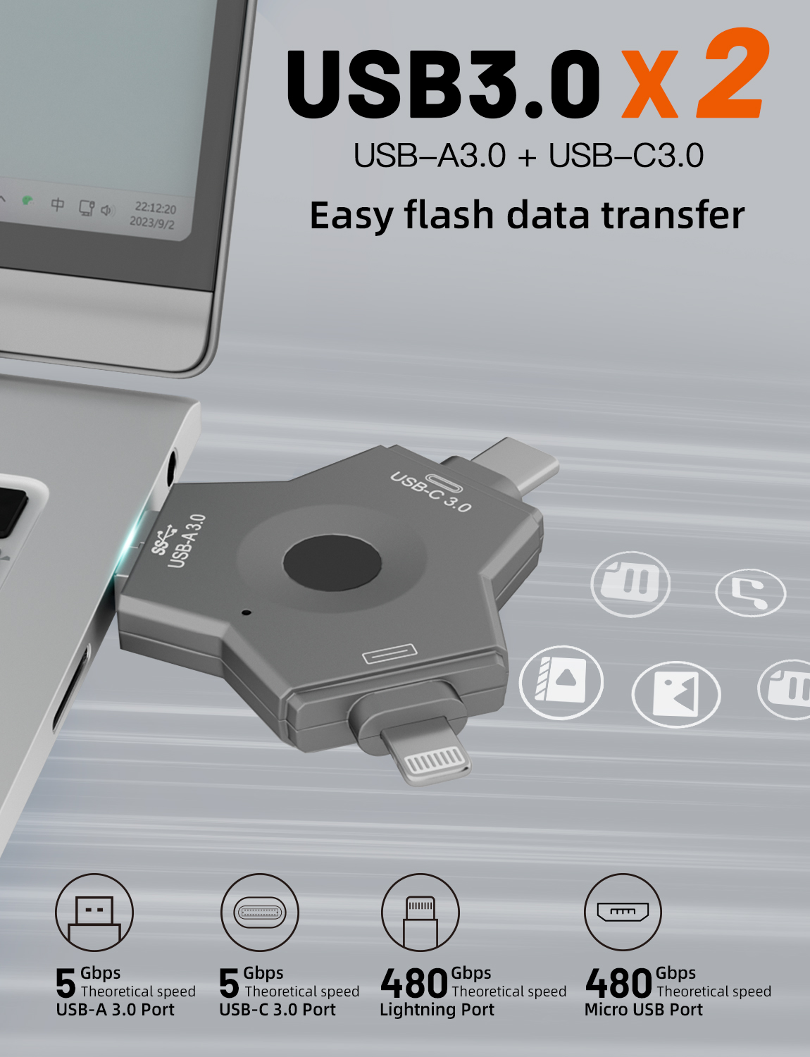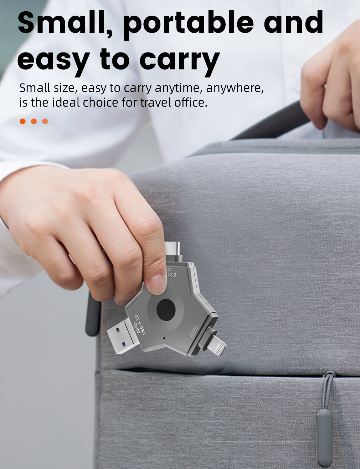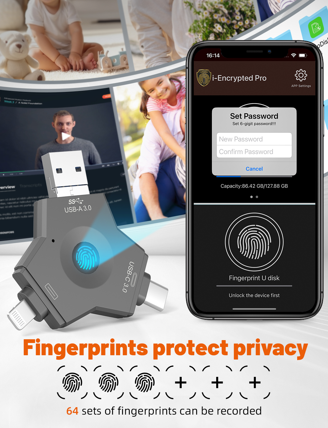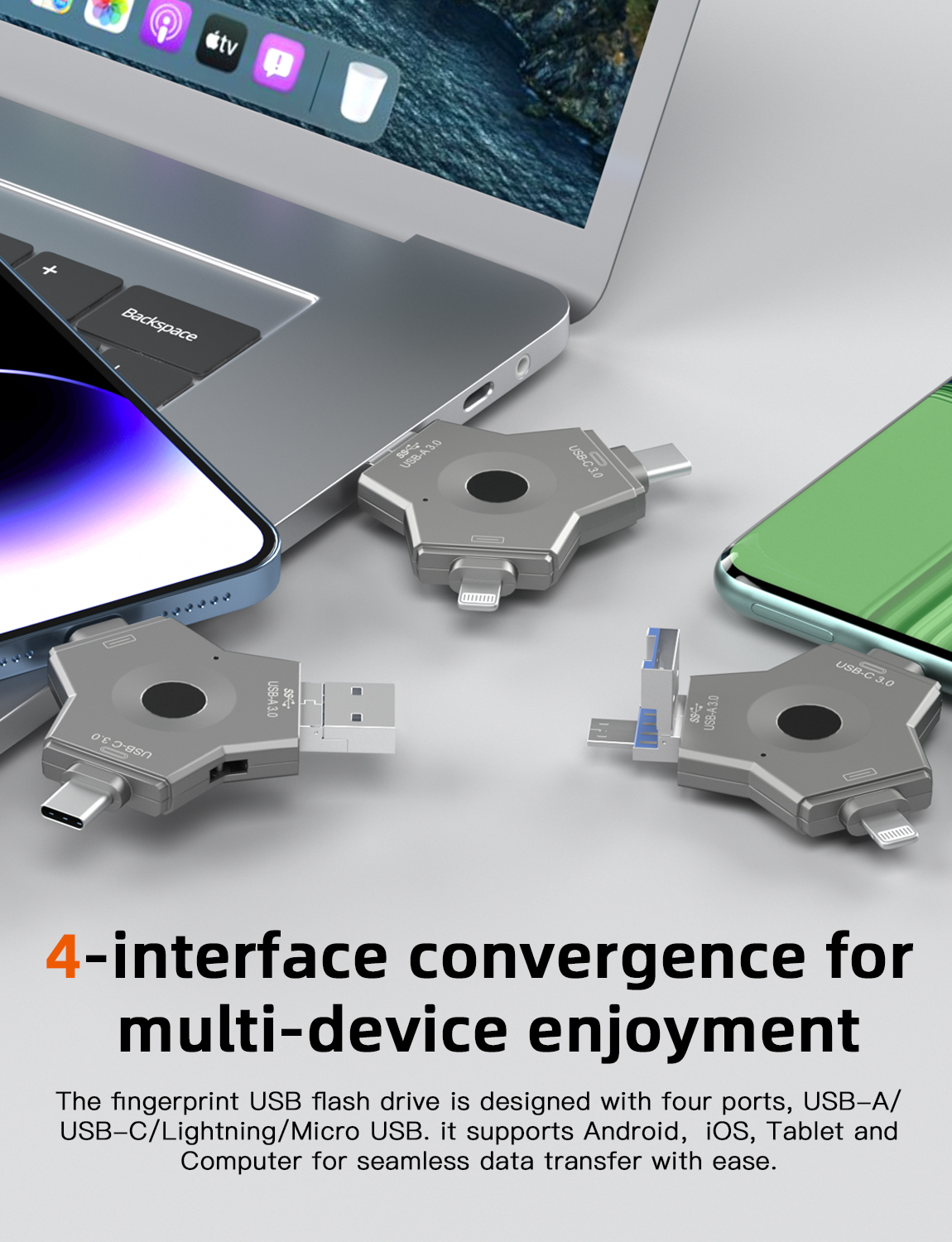 As a professional digital accessories provider, ZOIOT presents this 4-in-1 fingerprint encrypted USB 3.0 flash drive, designed for secure cross-device data storage and sharing. Featuring USB-A 3.0, USB-C 3.0, Lightning, and Micro USB four interfaces, it supports plug-and-play across Android, iOS, Windows, and Mac systems, delivering high-speed transmission (USB 3.0 up to 5Gbps, Lightning/Micro USB up to 480Mbps) for photos, videos, and files. With 360° fingerprint recognition and full-disk encryption, it offers password-fingerprint dual protection, supporting up to 64 fingerprint users. Crafted from durable metal with a compact, portable design, it ensures easy carry for travel and office use. Paired with the exclusive "i-Encrypted Pro" APP, it enables one-click backup and flexible user management, making it ideal for protecting personal privacy and business data, catering to cross-border e-commerce and corporate procurement needs.