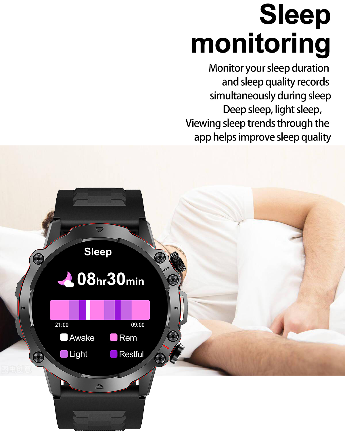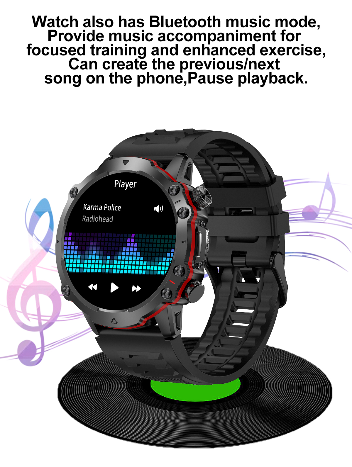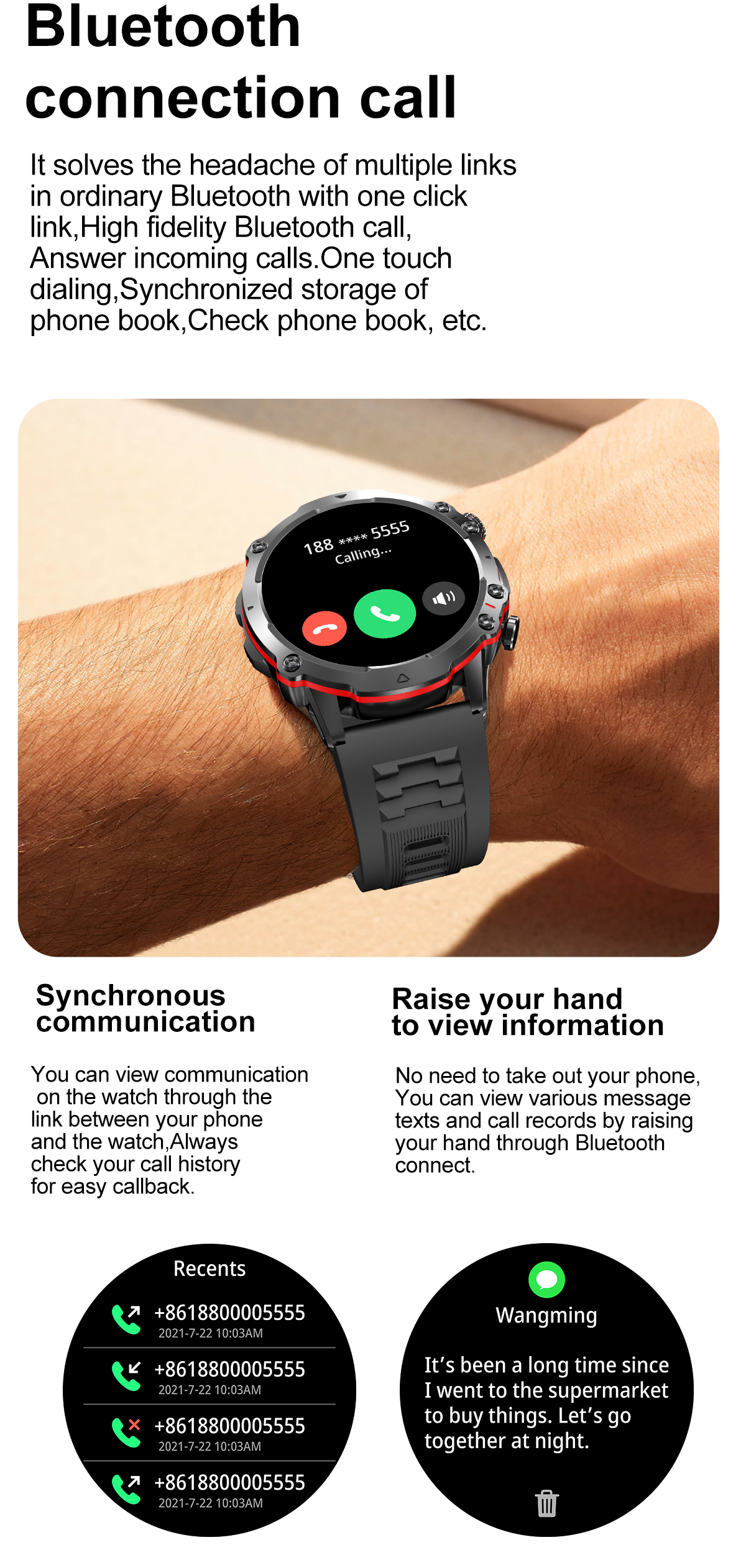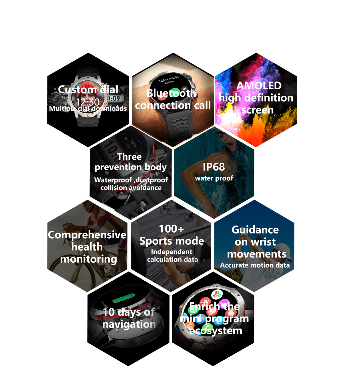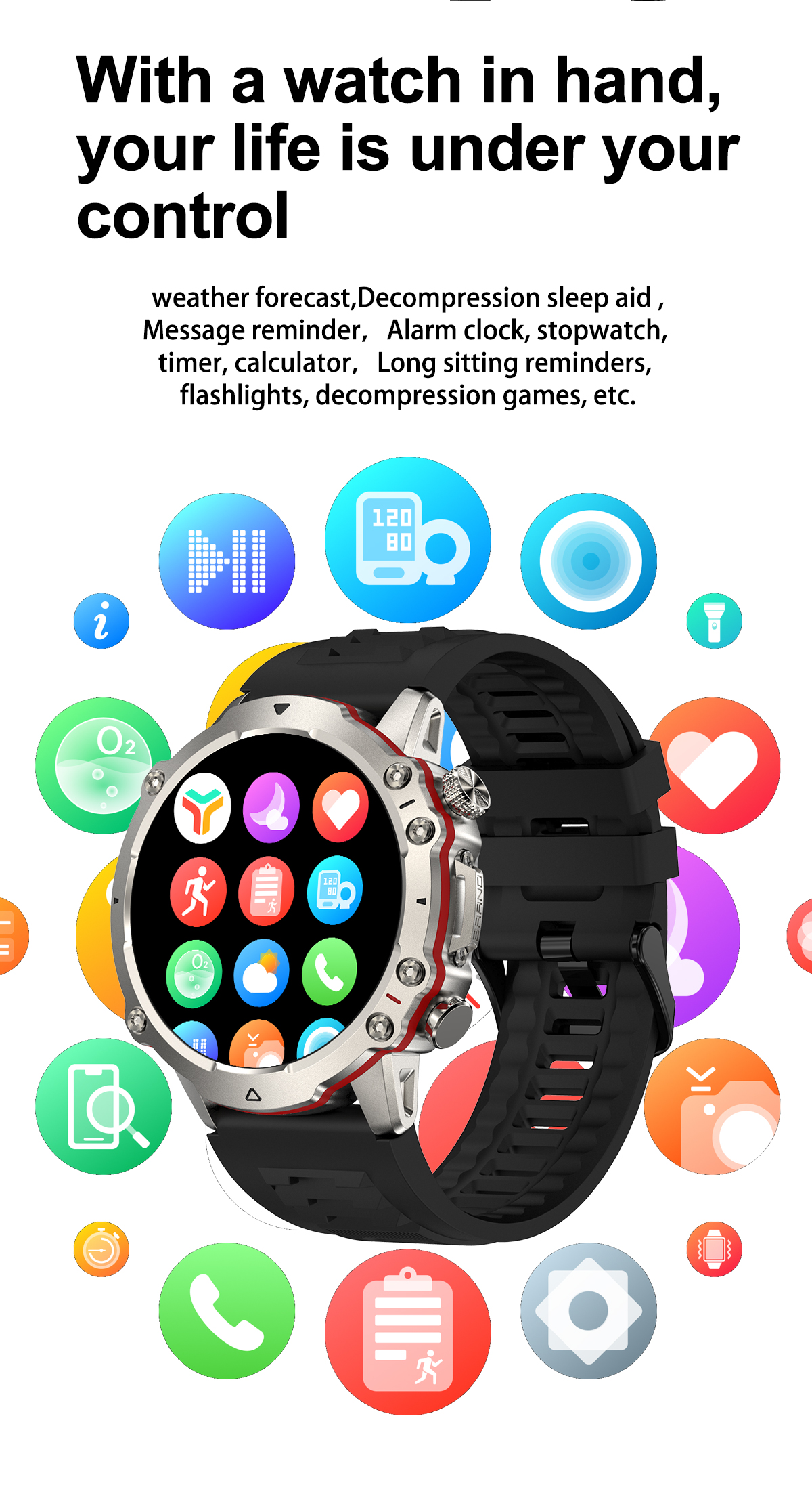 Basic FunctionsBluetooth calling,Heart rate,Blood Pressure,Blood oxygen,AI Voice ,100+Sport modes,ETC.