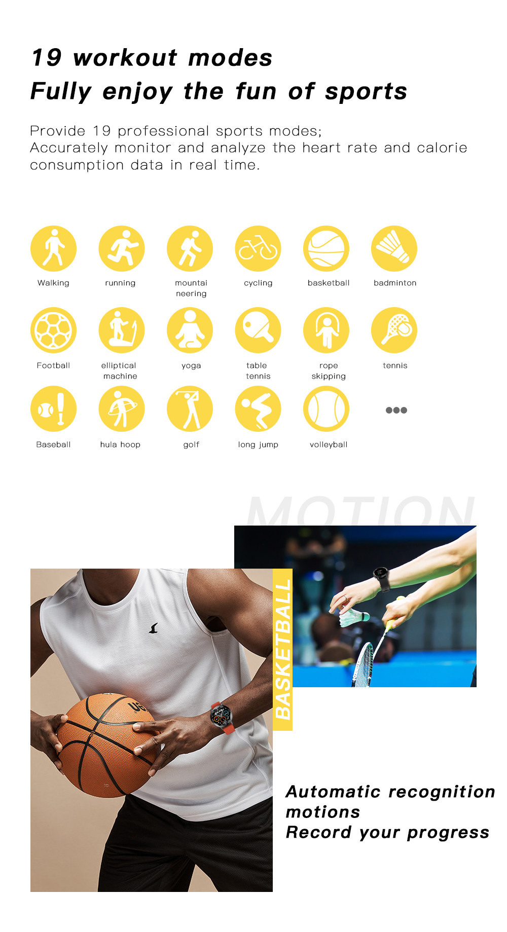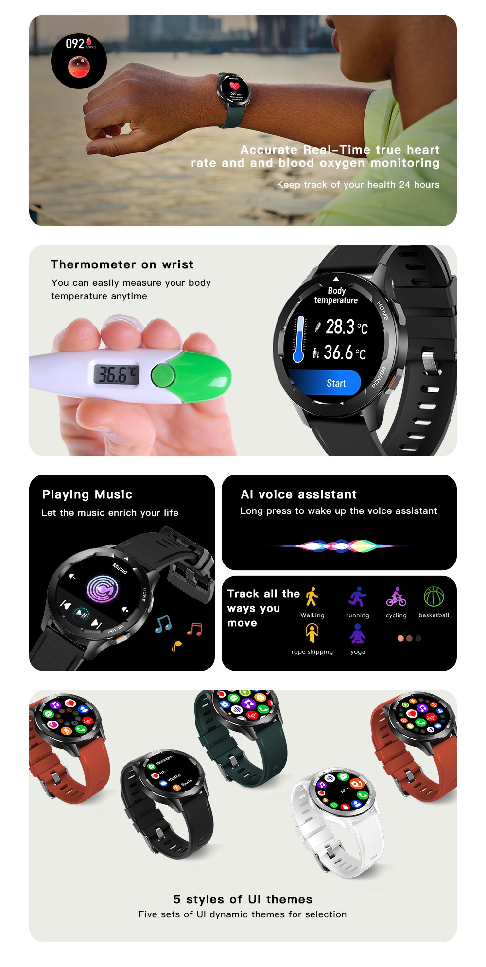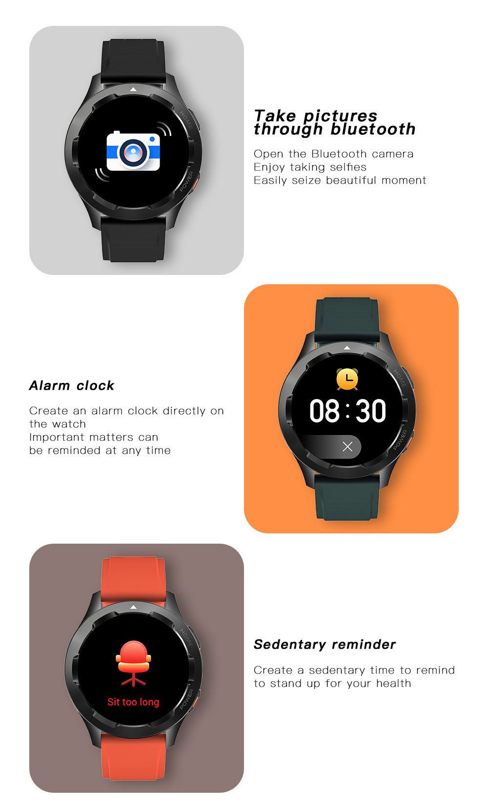 Basic FunctionsBluetooth calling,Heart rate,Blood Pressure,Blood oxygen,AI Voice ,120+Sport modes,ETC.