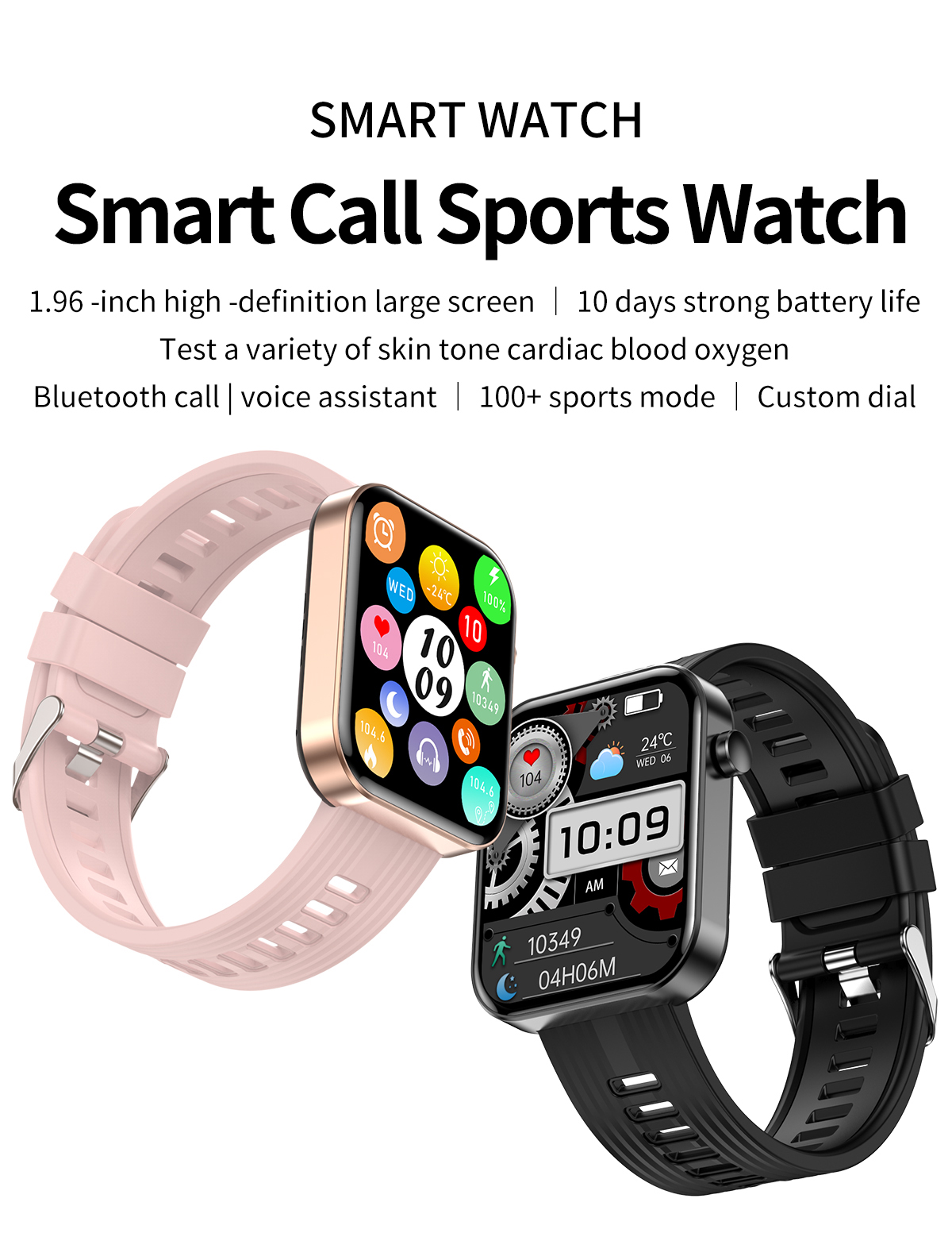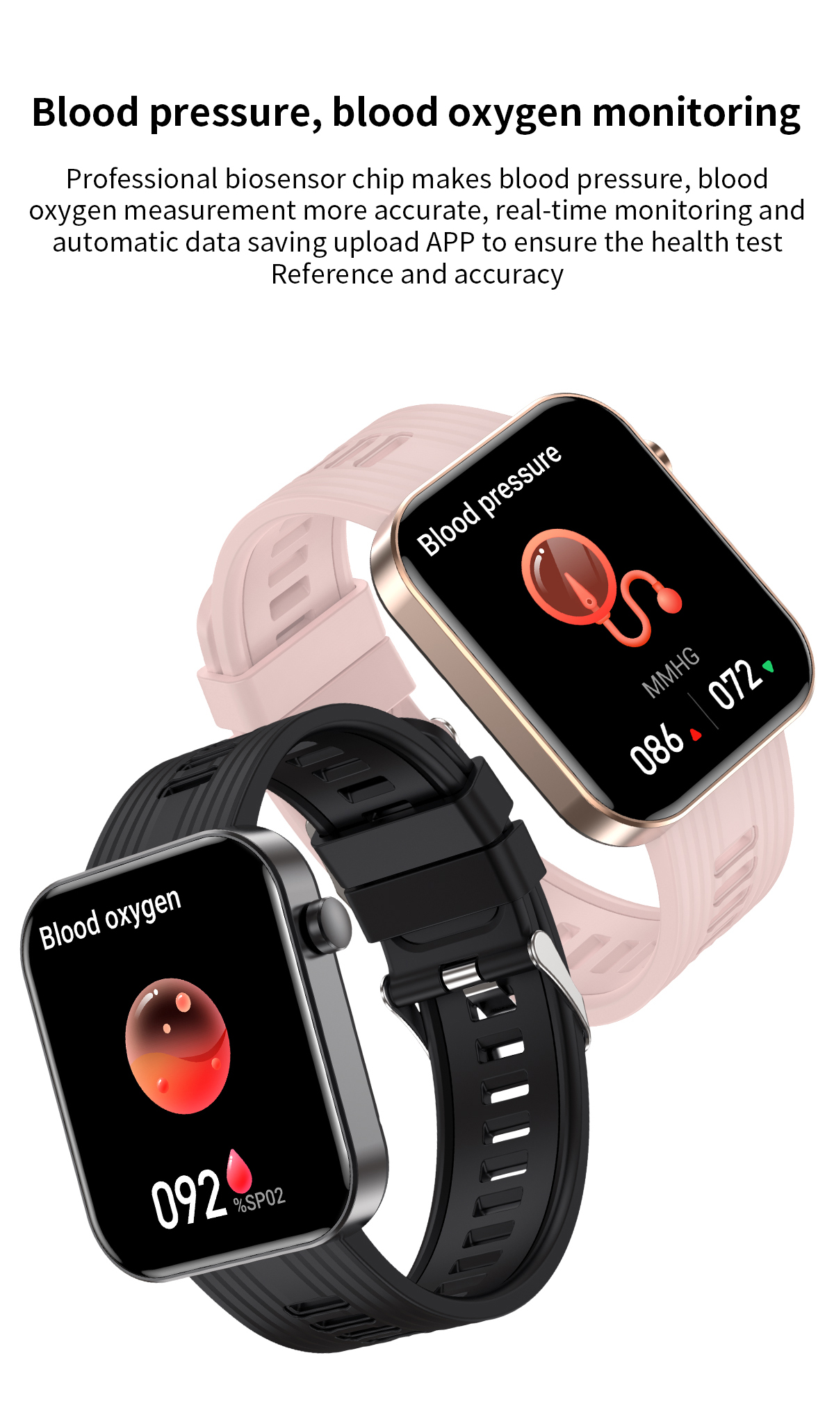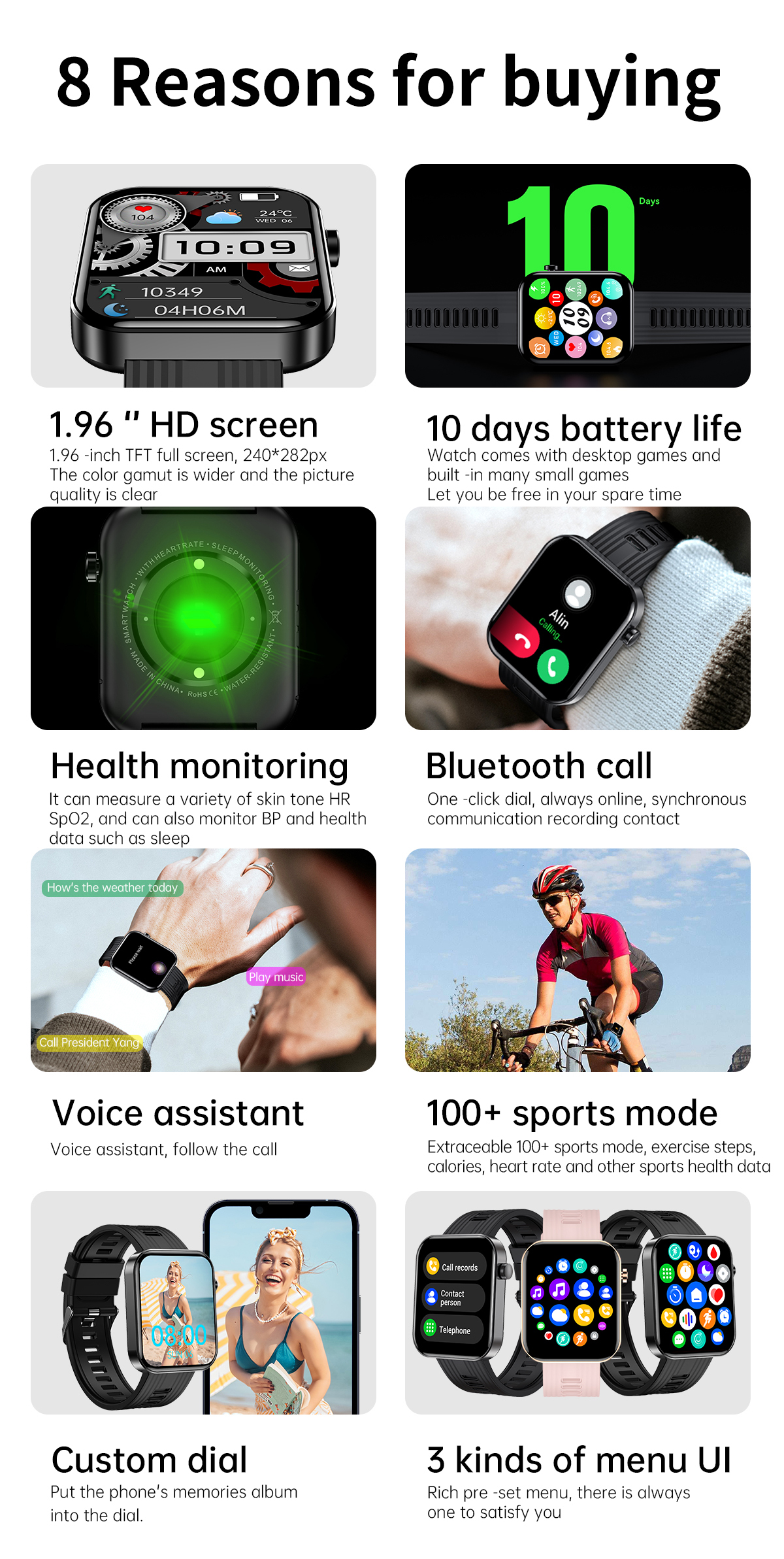 | Basic Functions | Bluetooth calling,Heart rate,Blood Pressure,Blood oxygen,AI Voice ,120+Sport modes,ETC. |