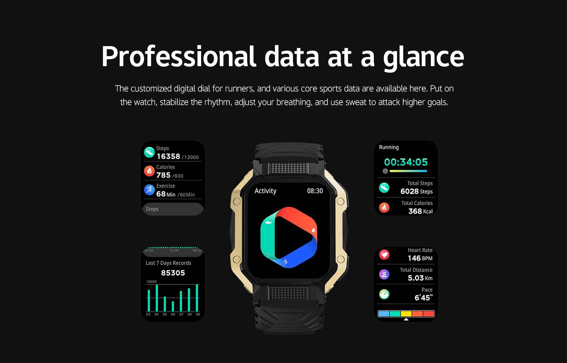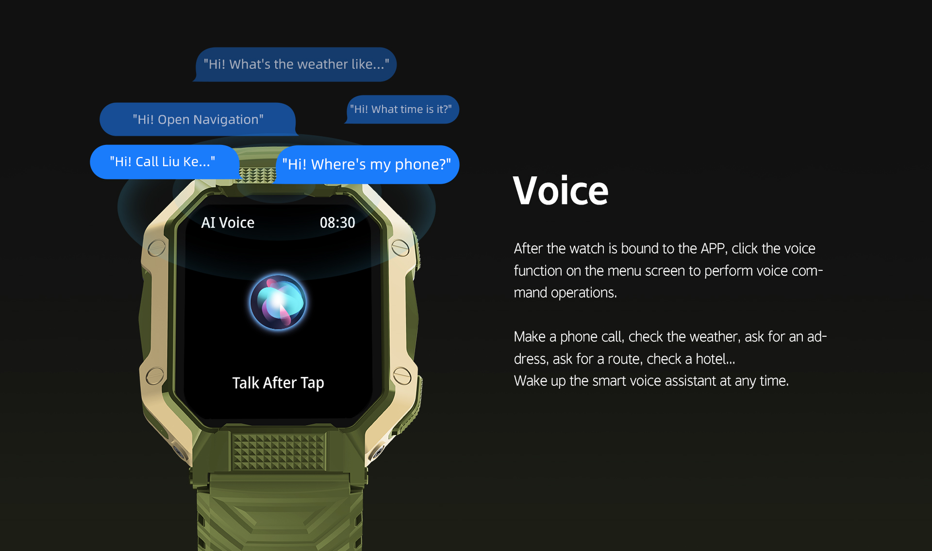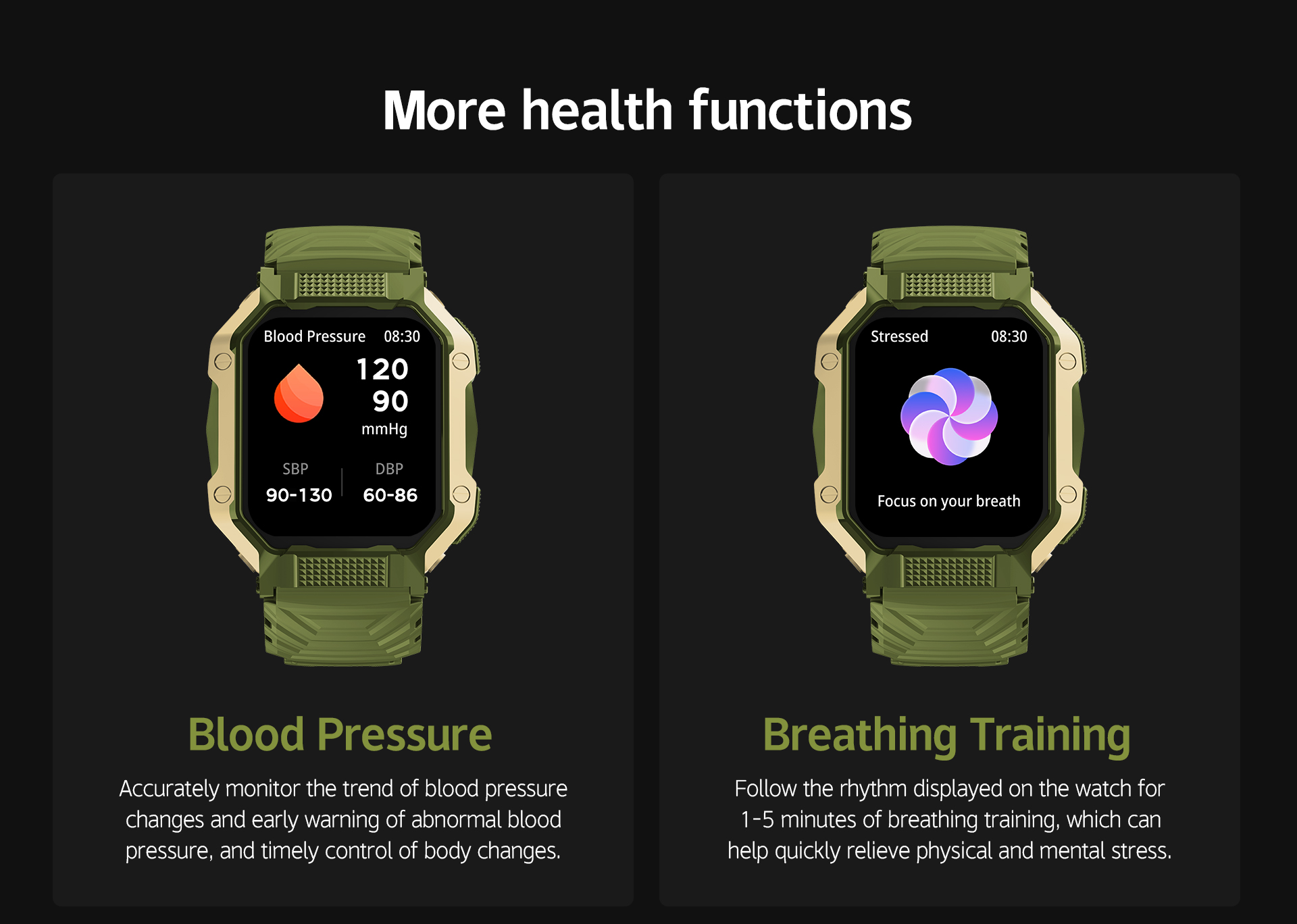 | Basic Functions | Bluetooth calling,Heart rate,Blood Pressure,Blood oxygen,AI Voice ,120+Sport modes,ETC. |