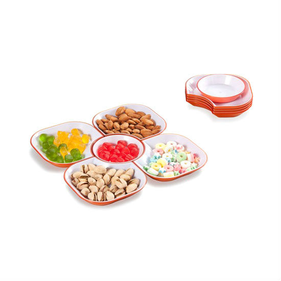 This is a set of snack plates which includes four shallow square plates and one round plate. This set is assembled by placing the round one at the center with the four others around. The plates are stackable for easy storage. Fill them with nuts and candies then place it on your dinning table for a nice display.