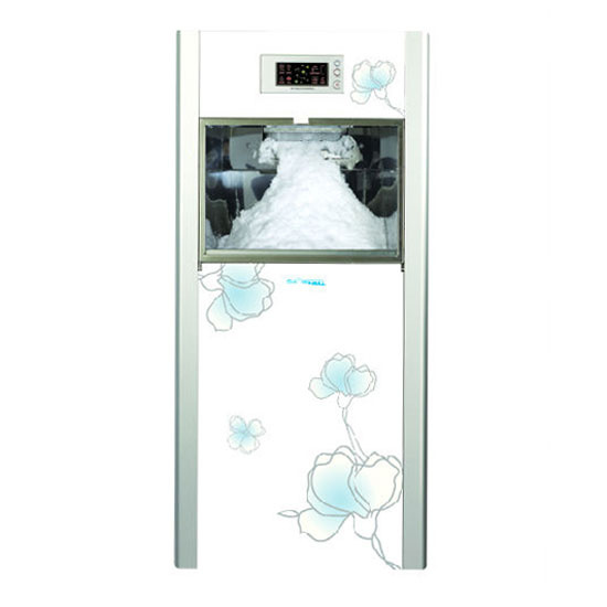 This stylish snow ice maker features an elegant white stainless steel housing accented with flower motifs. It is designed with a transparent window to show the snow ice making process. The high-performance snow ice maker is automatically operated with a digital control system.
