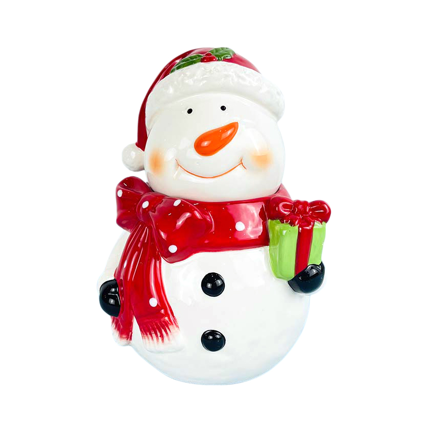 A vivid and adorable snowman-shaped cookie jar for adorning the room at Christmas and keeping small items like cookies, candies, etc. Advanced with fine ceramic for higher quality, the durable jar that is hard to crack or break is a subtle blend of practicability with aesthetics. Perfect for adding a festive atmosphere to the home.
