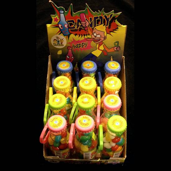Featured are candies that come with an interesting design. The candies are stored in a pseudo soda bottle which comes with an opener. This candy toy provides the fun of both playing and eating for kids.