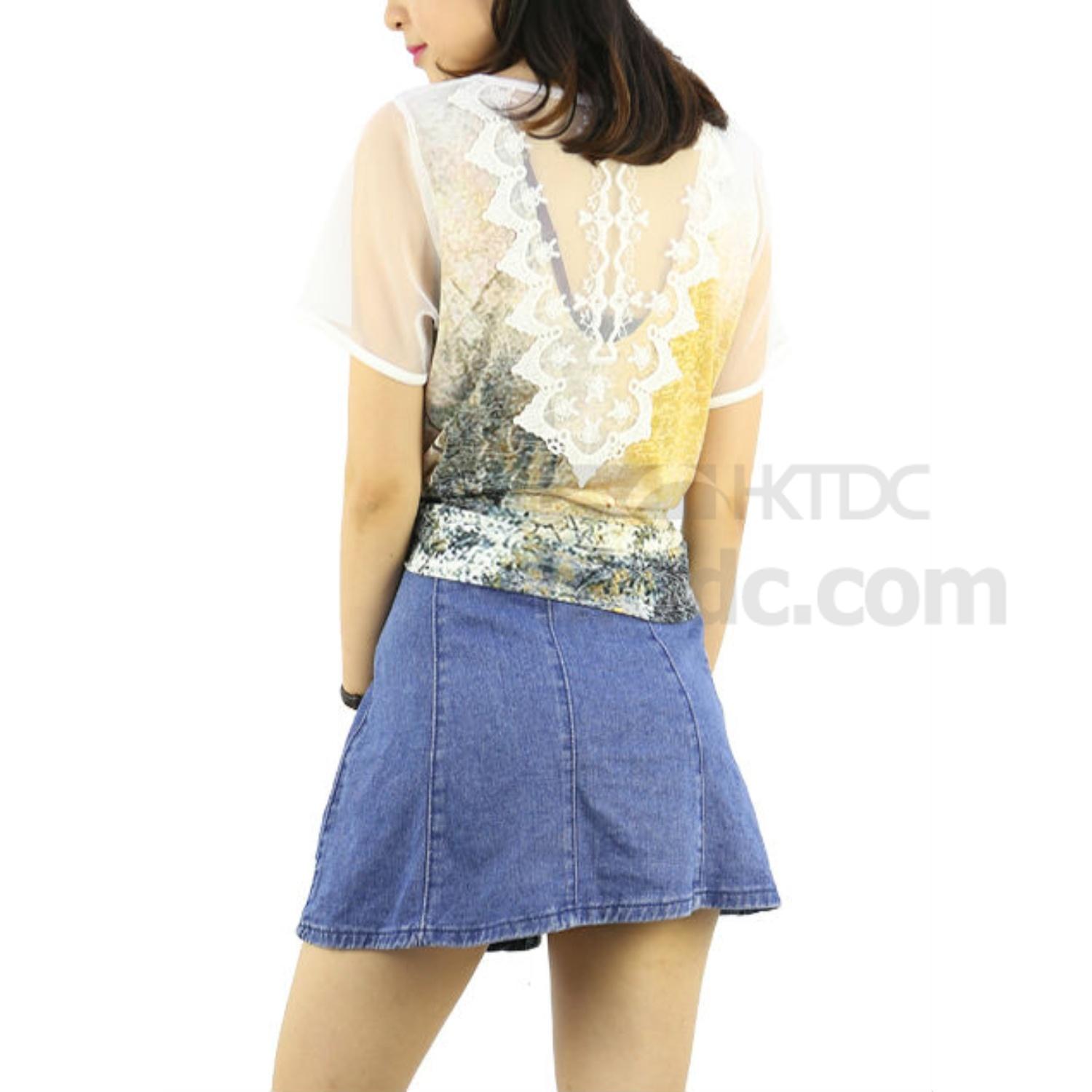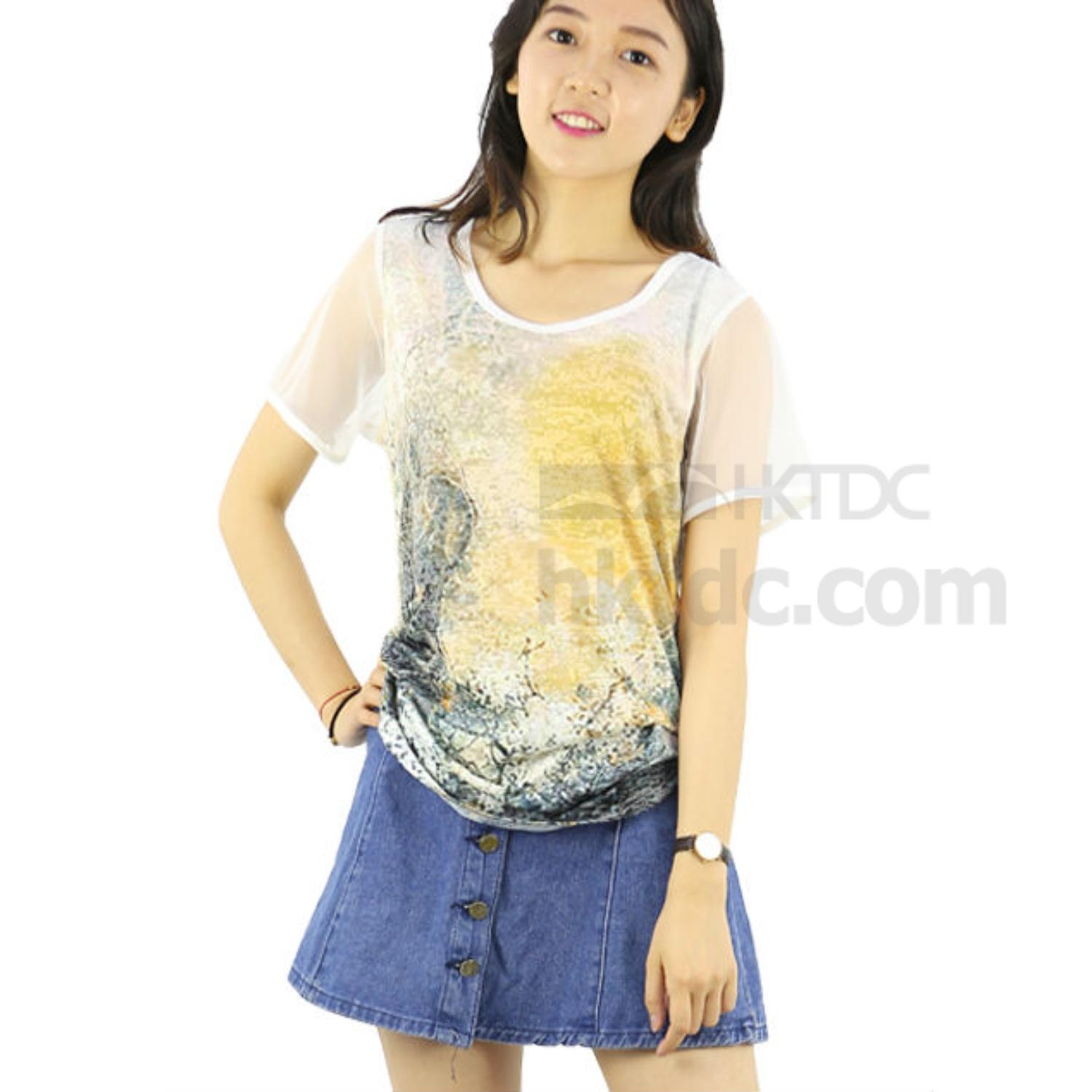 This T-shirt is made from burn-out, lace, and mesh fabric, using sublimation printing.