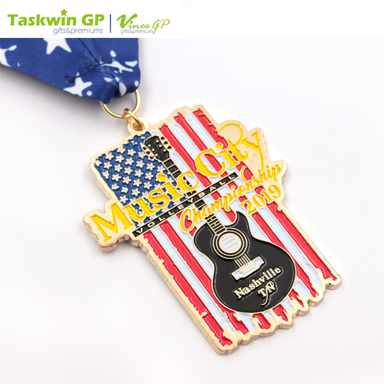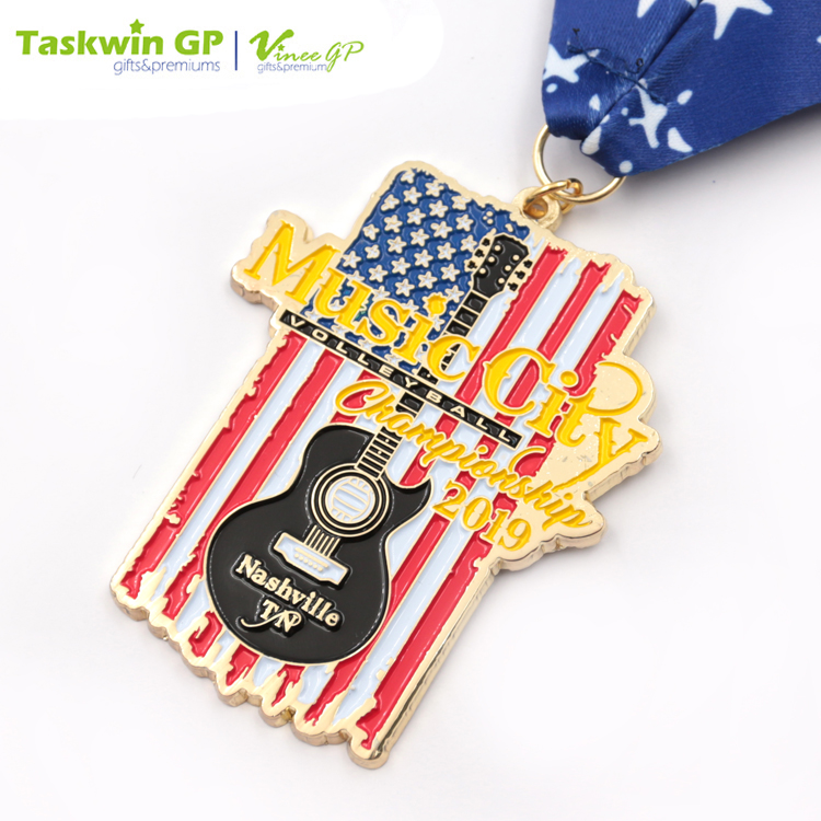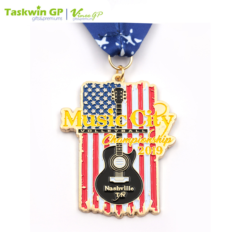 This zinc alloy medal is gold plated and is perfect as an award for sports and musical events. It has an American flag as the background and shows the name of the event on the surface. The zinc alloy medal is attached with a neck ribbon and is well-crafted to ensure a classy look.