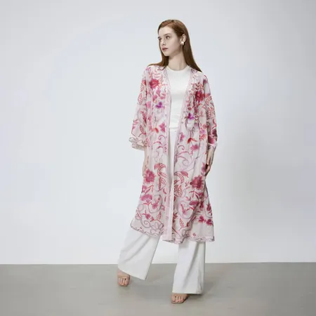this soft surroundings women's dress,multicolor floral pattern and metallic embroidery. Lightweight robe cardigan design 3/4 sleeves suitable for summer, fall and spring.Multi-coloured floral print front open dress.free-flowing sleeves, a round neckline and a relaxed fit.Satin fabric for a relaxed and cosy feel.Summer women's dress for dates, weddings, birthdays, cocktail parties, parties, clubs, dinners, beaches, vacations, holidays and everyday wear.