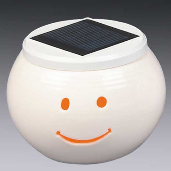 This round solar ceramic light in white features a smiling face cutout for a cute touch. It is equipped with a solar panel on the top and 2 super bright LEDs. This attractive LED solar light is great as a promotional gift, a decoration for homes, cafes and bars.