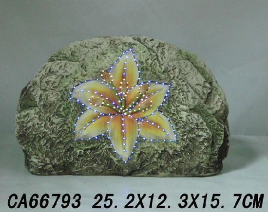 Disguised as a mossy rock, this outdoor lighting decoration outlines a lily in bloom with radiating beams. The yellow flower adds grace to the pavement during day and shines with two shades of light at night.