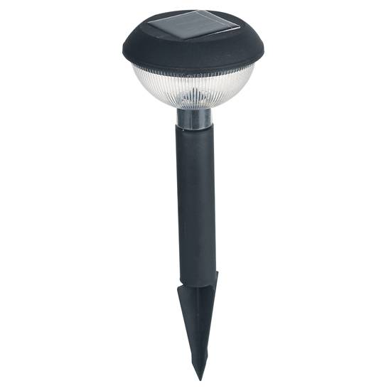 This is a solar garden light with a plastic small cap covering the lamp. It has a pointed end which allows it to be placed into the ground. It has a simple and classical design which makes it decorative as well as practical.