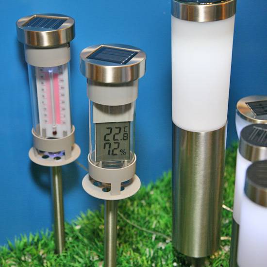 These are solar generated outdoor lights. They are made of stainless steel which is weatherproof. It shows temperature and humidity.