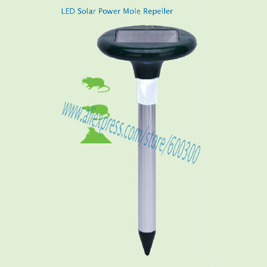 Pictured is a pest repeller operated with solar energy. Its tube is made with aluminum for added durability. It effectively keeps moles, gophers and burrowing rodents away.