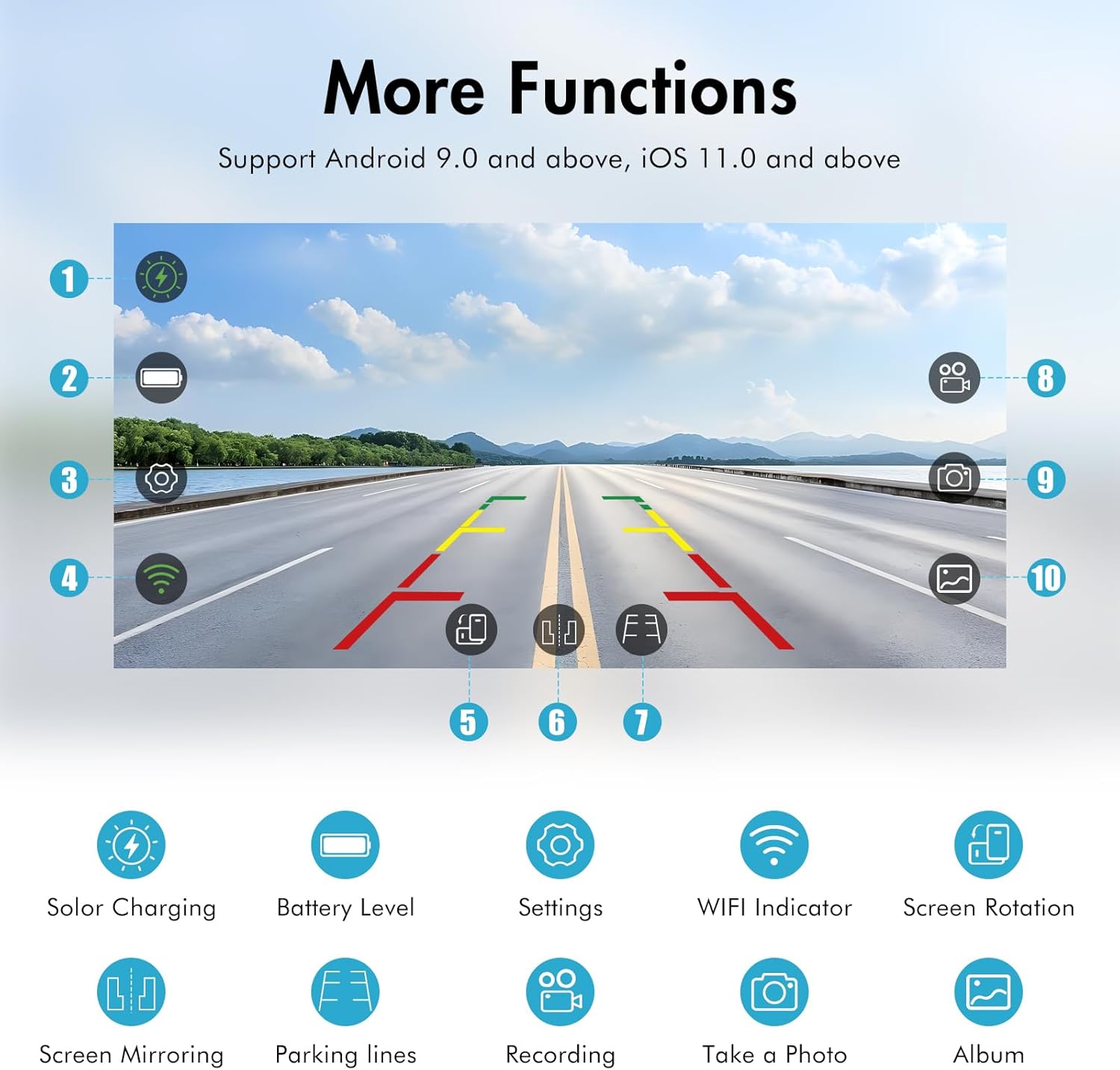 【Use Your Phone/Tablet Monitor】 The Solar WiFi Backup Camera comes with the "Ebikam Driving" phone app. Use your iPhone iPad Android cellphone smartphone tablet to connect its Wi-Fi, you can see what's happening behind your vehicle on the app. No monitor on dash any more.