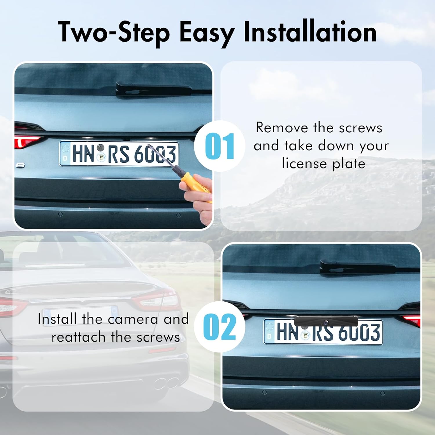 【Easy to Use & No Wiring Installation】 Effortlessly set up your wireless wifi backup camera with the APP for iPhone or Android device. Then install the camera in 3 steps: 1. Choose upward or downward direction for installation and unscrew the the screws from the license plate 2. Clamping the camera to the slot of the bracket 3. Attach the camera to the license plate and tighten the screws as well as the anti-theft screws