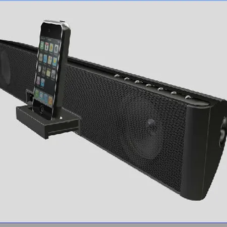 Pictured is a sound bar with a iPhone/iPod docking station. The speaker system impresses you with exceptional acoustic output and its fashionable appearance. This sound bar also allows you to listen to your iPhone/iPod.