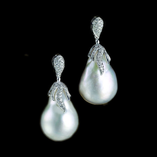 This is a pair of earrings with big baroque south sea pearls. Each piece features an 18K white gold mounting with diamond elements. This pair of earrings will add a touch of elegance to your look.