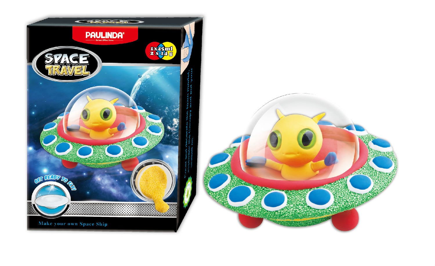 Displayed here is a modeling dough set for making a space travel themed ornament. It can be made into a round shaped UFO with dots on the side with a small yellow alien inside. This space travel ornament is fun to make and is excellent for decoration use.
