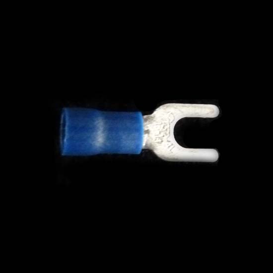 As shown is a spade pre-insulated terminal coming with a solderless design. The copper part of it is finished with tin plating. The blue insulating jacket is made of PC, PVC and nylon.
