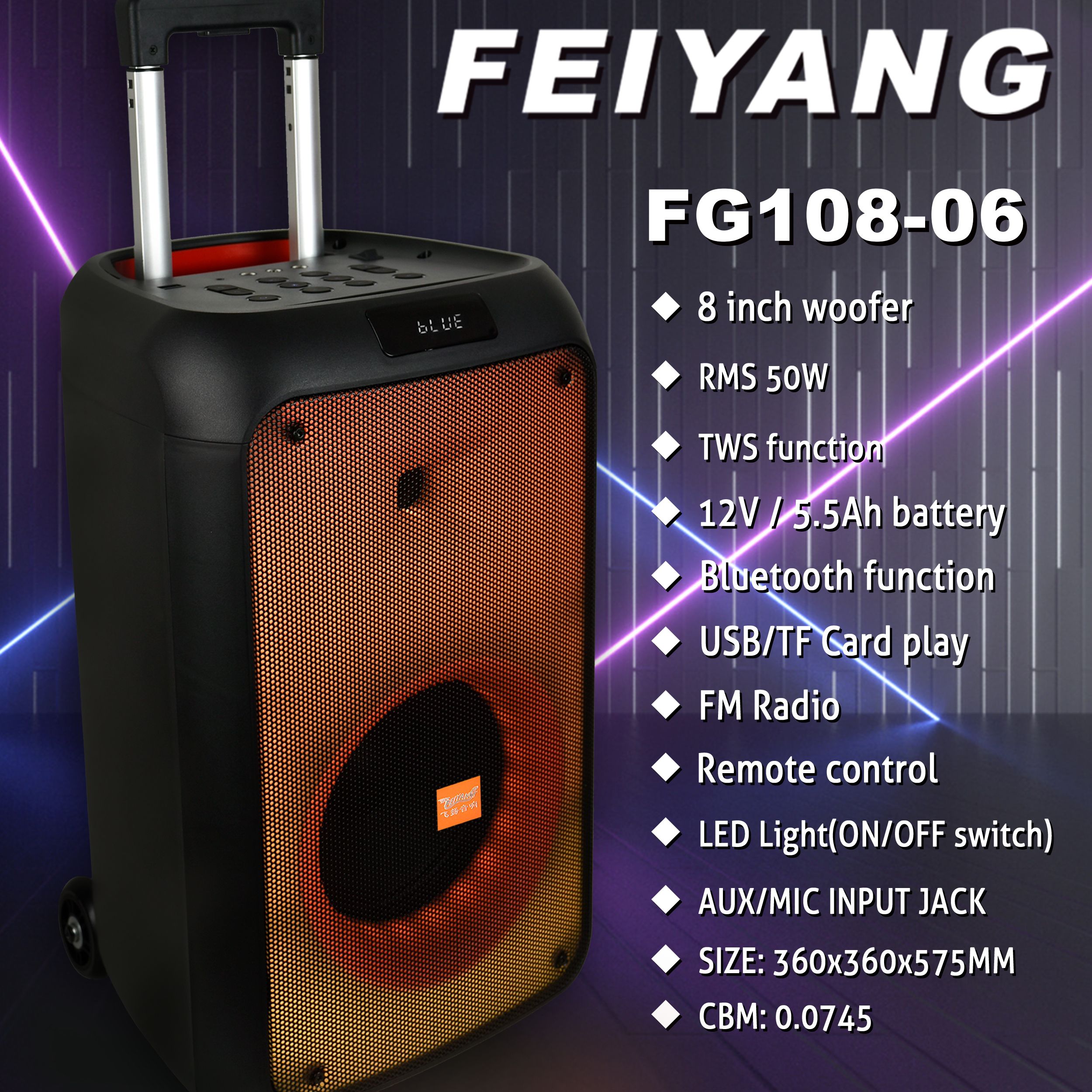 Bluetooth/USB/TF/FM /REC/remote control/12V 5.5ah lead-acid battery /AUX Input /two mic input jack/one guitar input jack/ Mic priority function/changeable flame light on front/RMS:50W