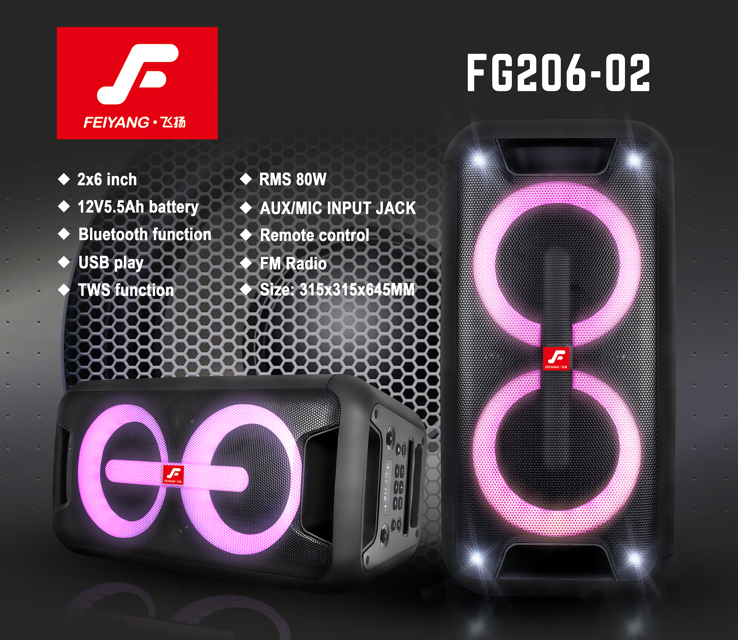 Record/12V , 5.5Ah battery /AUX Input /Light on woofer / EQ/ Mic input/Guitar input / English Voice broadcast/ 12V/not trolley /80W