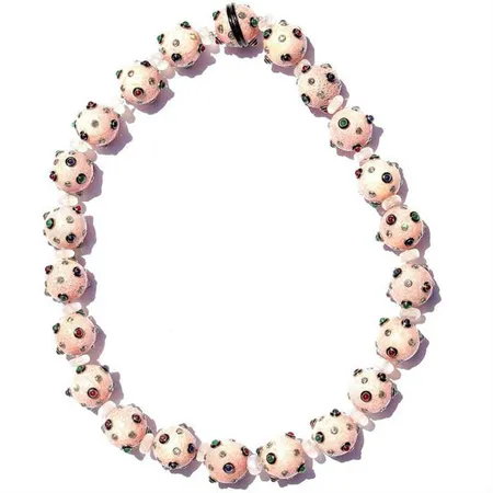 Fantasy has become reality through the extraordinary craftsmanship of this necklace. Designed with perfectly bezel set bright cabochon rubies, emeralds, sapphires and round cut diamonds excellently accented by circles of onyx. Hand crafted in platinum. 21 inches long