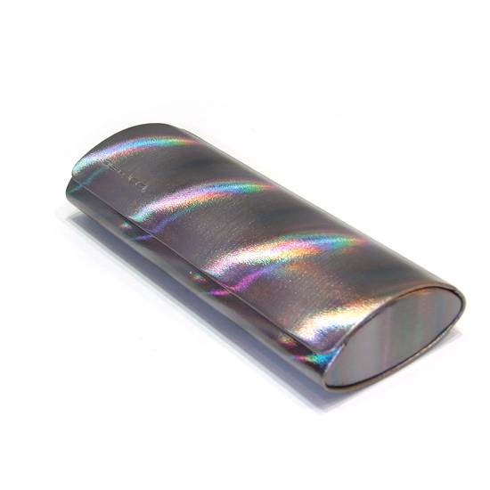 This is a spectacle case made of polyurethane (PU) plastic, which gives it a soft and shiny surface with the reflection of lights to rainbow-like colours.