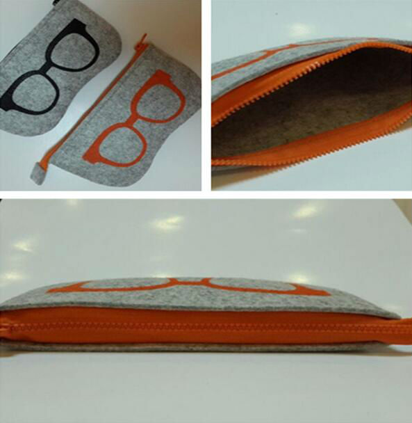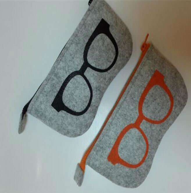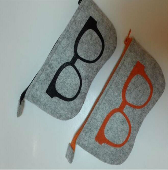 This is a solid-colored eyewear bag featuring a funny wayfarer frame sign in the front. The oblong pouch is made to hold one pair of glasses. It is completed with a contrasting zipper closure which stops the contents from falling out.