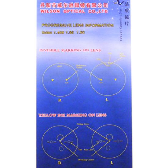 This is progressive lens for glasses. This product is made of high quality material. Invisible marking and yellow ink marking on lens for convenience.