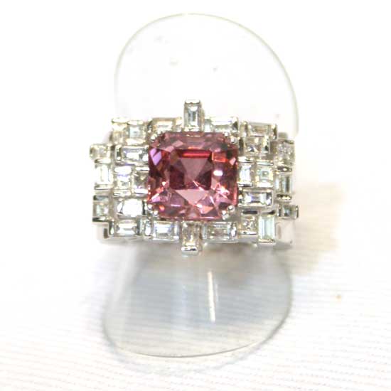 Pictured is a spinel ring with a square-cut center stone that touts elegant translucency. The gold band is paved with diamonds of assorted sizes to build an irregular shape. This spinel ring is a classy piece to match your evening party attire.